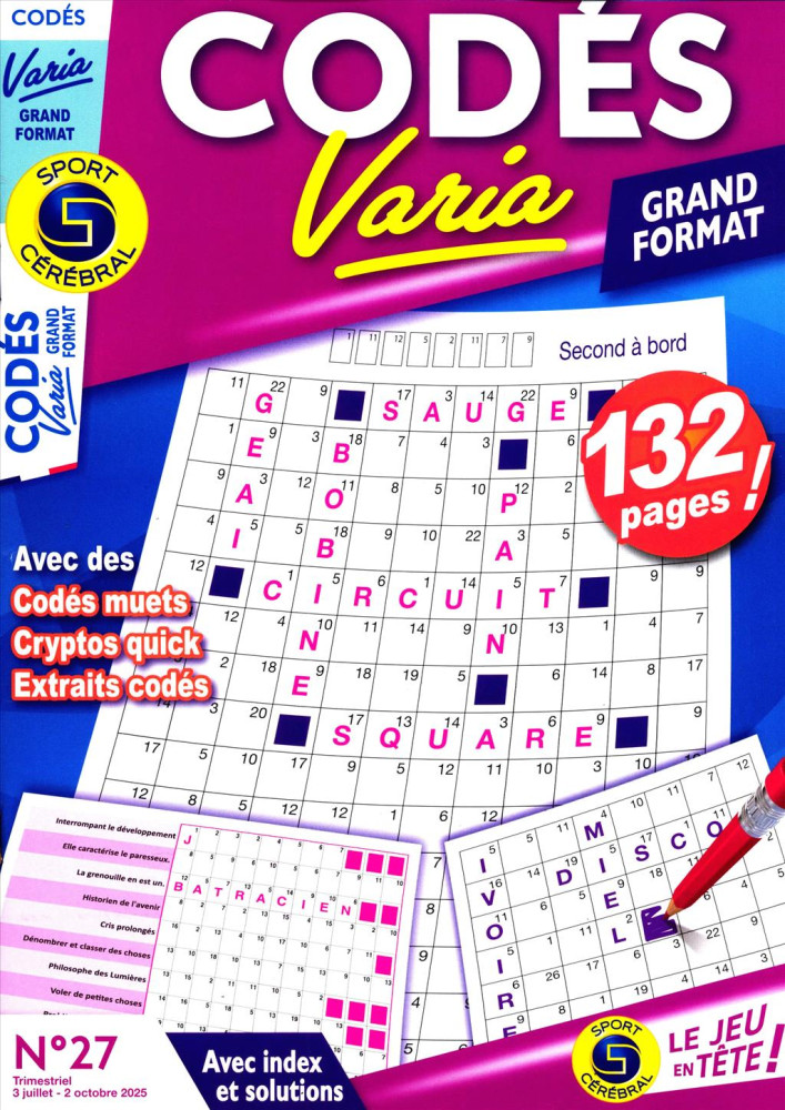À tous les fans du Codés Varia, voici la version grand format de votre revue préférée ! Dans Codés Varia grand format, vous retrouverez des énigmes proposées à chaque grille, que vous devrez résoudre en décryptant la grille associée, mais en version géante, pour plus de challenge.