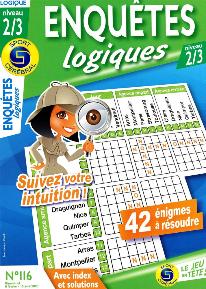 Menez l'enquête ! Suivez votre intuition et utilisez votre bon sens, ils se révéleront très précieux pour rechercher la vérité. Avec Enquêtes logiques niveau 2/3, de Sport Cérébral®, faites appel à votre flair pour résoudre les grilles mystérieuses et confirmer vos talents de détective ! Et si des indices venaient à vous manquer, l'index en fin de revue vous donnera un coup de pouce pour triompher du niveau de difficulté progressif !