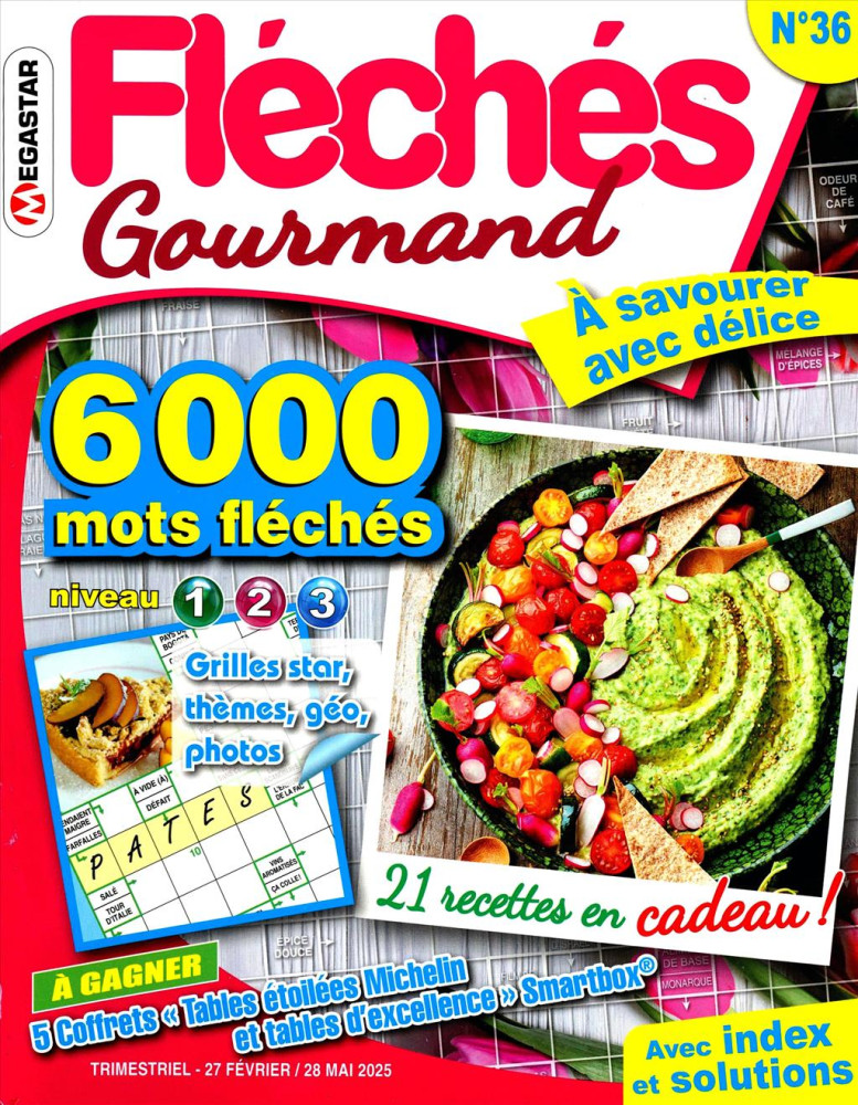 Pour les amateurs de saveurs, pour vous qui avez le goût des mots, Fléchés Gourmand a mis les petits plats dans les grands pour vous faire goûter à quelques-unes de ses spécialités. Au menu, des grilles de mots fléchés de tous niveaux, classiques, à thème, géo, chefs et des grilles originales comme les fléchés casés, les quiz ou les définîmes, toutes réunies autour d'une même passion : la cuisine. Cerise sur le gâteau, un cahier de recettes gourmandes vous est offert à chaque numéro !