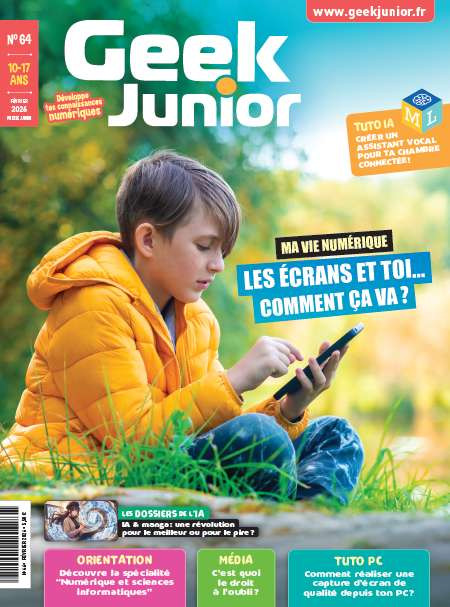 Développe tes connaissances numériques ! Geek Junior est le premier magazine d'éducation numérique pour les collégiens (10 - 15 ans). Actualité, conseils, tutoriels. Chaque mois, 32 pages pour se tenir informé de l'actualité geek et développer une solide culture numérique. Programmation, robotique, applications, réseaux sociaux. La génération connectée a enfin son magazine !